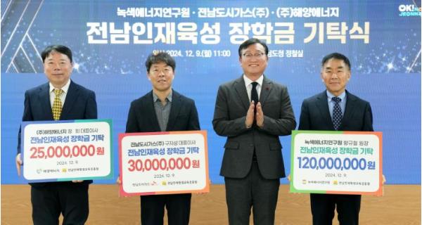 [중앙뉴스라인, 김민수기자] 전라남도는 9일 인재양성 장학금으로 (재)녹색에너지연구원이 1억 2천만 원, 전남도시가스(주)가 3천만 원, ㈜해양에너지가 2천500만 원을 (재)전남인재평생교육진흥원에 기탁했다고 밝혔다.