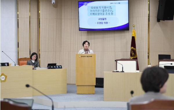 조영임 의원은 “현재 구 단위로 운영하는 다회용기지원센터를 시민들이 쉽게 접근하고 이용하도록 하기 위해서는 동별로 운영해야 한다”며 “다회용기 수거·세척 등의 사업 관련 마을형 일자리도 만들 수 있다”고 제안했다.