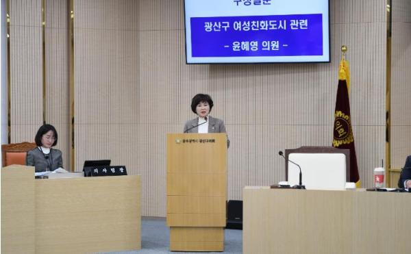 [중앙뉴스라인, 손기주기자] 윤혜영 광산구의원(더불어민주당, 신흥동·우산동·월곡1·2동·운남동)이 9일 제293회 광산구의회 정례회 제2차 본회의에서 광산구의 여성친화도시 및 문화예술 정책과 관련하여 구정질문을 펼쳤다.