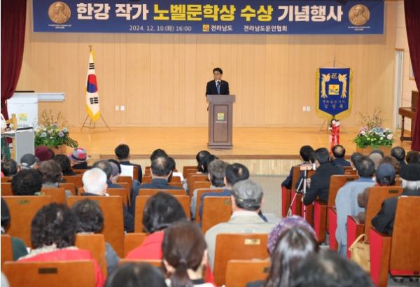 이날 기념행사에는 김영록 지사와 전남문인협회 회원, 도민 등 200여 명이 참석한 가운데 한강 작가의 영상 상영과 작품세계 문학특강에 이어 시낭송, 수상축하편지 낭독, 축하공연 순으로 진행됐다.
