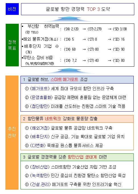 이에 정부는 글로벌 거점항만으로서의 부산항의 위상을 공고히하고 항만 경쟁력을 세계 TOP 3 수준으로 높이기 위하여 이번 방안을 마련하였다. 해양수산부는 부산항의 운영체계를 효율화하여 해운동맹 물량을 적기에 처리하도록 하고, 친환경?스마트 전환을 가속화하여 국제규범을 선도하는 항만을 만들어 나갈 계획이다.