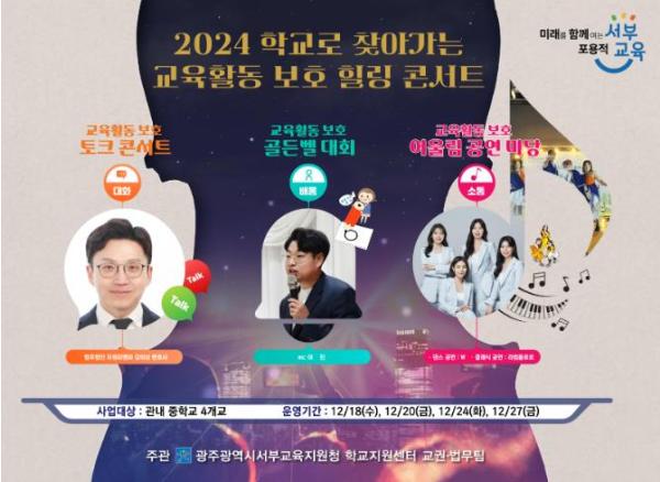[중앙뉴스라인, 손기주기자] 광주서부교육지원청은 오는 18일부터 27일 서구, 남구, 광산구지역 4개 중학교에서 ‘학교로 찾아가는 교육활동 보호 힐링 콘서트’를 개최한다.