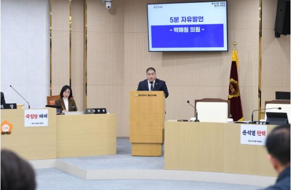 [중앙뉴스라인, 김효현기자] 박해원 광산구의원(더불어민주당, 첨단1·2동)이 20일 제293회 정례회 제3차 본회의에서 5분 자유발언을 통해 광산구가 AI 행정서비스를 선도적으로 추진해야 한다고 주장했다.