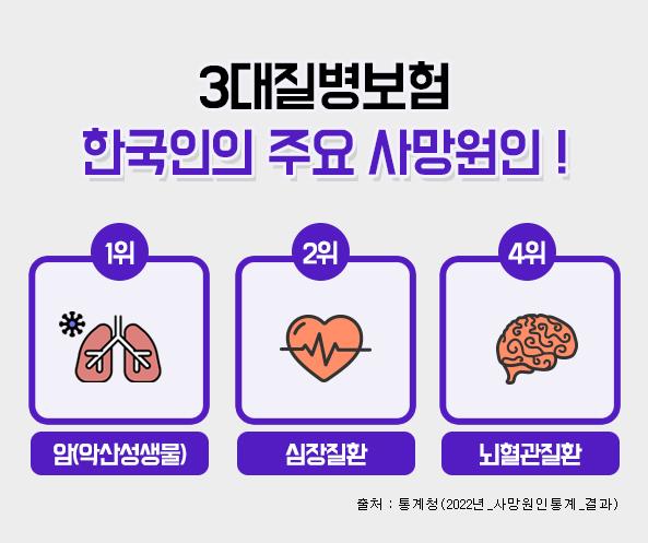 [중앙뉴스라인, 한성영기자] 3대질병으로 일컬어지는 암, 뇌혈관질환, 심혈관질환은 한국인의 주요 사망원인에서 상위를 차지하고 있으며, 이에 대한 진단비를 집중적으로 보장해 주는 보험상품을 3대질병진단비 보험이라 할 수 있다.