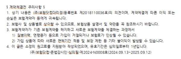 참고로 병력을 가지고 있는 사람이라면 유병자보험 상품을 고려해 볼 수 있다. 유병자보험은 간편심사보험이라 칭하는데, 유병력자에 대한 가입조건이 보다 완화된 상품인 만큼 유병자라면 검토해 보는 것이 권장된다. 단, 가입 시 고지의무 준수는 필수적이므로 추후에 불이익이 발생하지 않도록 주의를 기울여야 한다.