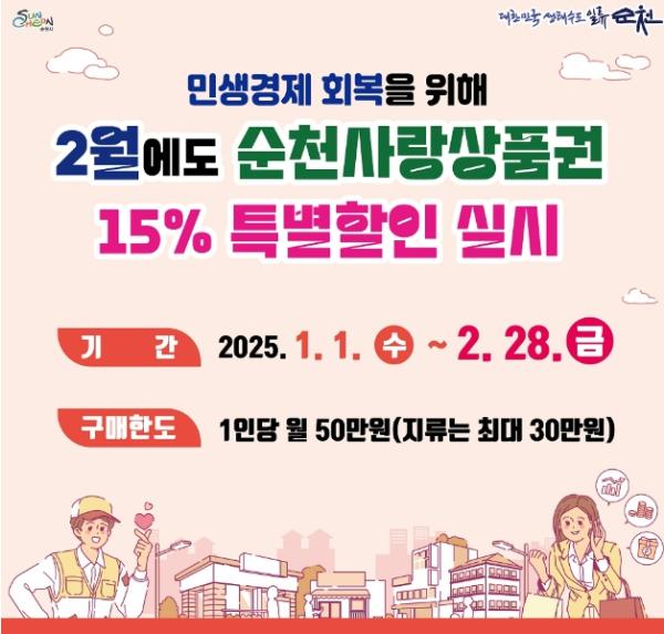 [중앙뉴스라인, 전은희기자] 순천시가 민생경제를 살리고 지역 상권을 활성화하기 위해 1월 한 달간 실시할 계획이었던 순천사랑상품권 15% 특별할인을 2월 28일까지 연장한다고 밝혔다.