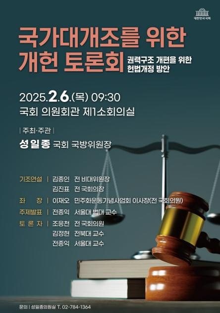 토론회를 주최하는 성일종 국방위원장은 “87 년 체제 이후 40 년 가깝게 유지돼 온 대통령 단임제에 대한 개편 필요성이 어느 때보다 절실한 시점 ” 이라며 " 이번 토론회가 여야 정치권이 각자의 유불리를 떠나 본격적인 권력구조 개헌 논의에 나서는 마중물 역할을 하게 되기를 기대한다 ” 고 말했다 .