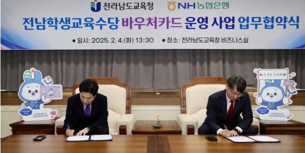 [중앙뉴스라인, 김민수기자] 전라남도교육청과 NH농협은행 전남본부는 4일 전라남도교육청 비즈니스실에서 ‘전남학생교육수당 바우처카드 운영 사업’을 위한 업무협약을 체결했다.