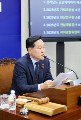 한편, 강 의원은 이날 기획조정실, 전남연구원, 전남개발공사, 자치경찰위원회 등 4개 부서의 업무 추진 상황을 종합 점검하며, ‘전남 행복시대’ 실현을 위해 집행부가 적극적인 정책 추진과 실질적인 성과 도출에 힘써줄 것을 당부했다.