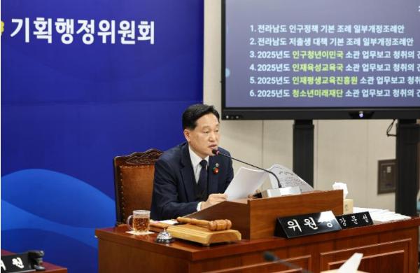 [중앙뉴스라인, 김민수기자] 전라남도의회 강문성 의원(기획행정위원장, 더불어민주당, 여수3)은 지난 2월 7일 인구청년이민국, 인재육성교육국 업무보고에서 “지역대학 특성화를 통해 ‘인재 양성-취․창업-정주’로 이어지는 선순환 생태계를 구축해서 지방소멸 위기를 극복해야 한다”고 강조했다.