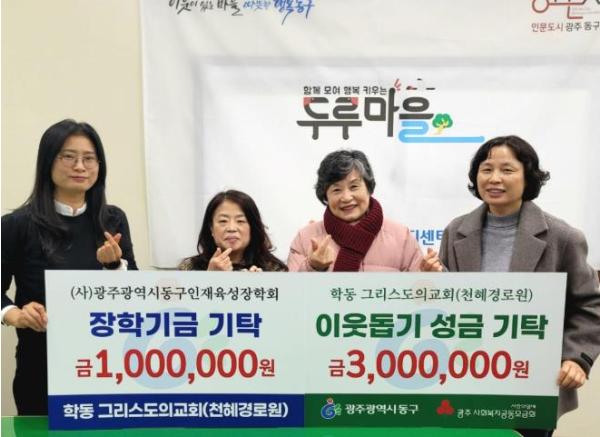 [중앙뉴스라인, 전은희기자] 광주 동구 학동은 천혜경로원(학동그리스도의교회)으로부터 어려운 이웃을 위한 후원금 3백만 원과 인재 육성 장학금 1백만 원 총 4백만 원을 기탁받았다고 밝혔다.