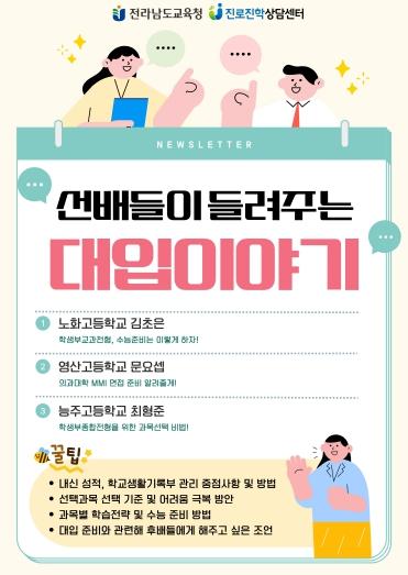 김은섭 진로교육과장은 “전남의 교육 환경이 녹록지는 않지만, 미담사례 발굴을 통해 학생들의 동기를 자극하고, 전남형 교육격차 해소 사업인 하이플러스 프로그램을 내실화하여 예비 수험생들이 목표를 향해 딛고 일어설 수 있도록 디딜돌이 되어 지원하겠다.”고 밝혔다.