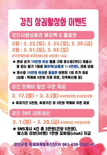 주요 이벤트로는 강진사랑상품권 영수증 페이백 이벤트, 꽝 없는 돌림판 이벤트, ‘강진맛깨비’ 먹깨비 할인 이벤트, SNS 내돈내산 특별 이벤트 등이 있다.