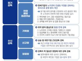 특히, 올해는 그간 별도로 계획을 수립하여 시행하던 노동과 산업안전보건 분야 감독의 통합‧연계를 강화하고, 업종(사업장) 전반의 구조적 취약 요인을 찾아 현장의 실질적인 개선으로 이어지도록 감독 방식과 내용을 전면 개편한다.