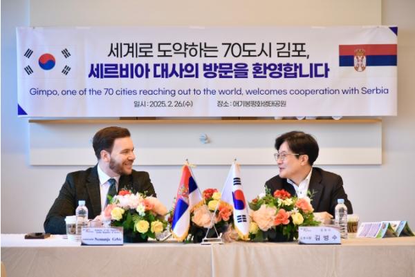 김병수 시장은 26일 애기봉평화생태공원에서 네마냐 그르비치(Nemanja Grbic) 주한 세르비아 대사를 만나 도시 간 교류에 대해 논의했다. 이날 회담은 주한 세르비아 대사관 측의 요청으로 진행됐으며, 양측은 김포시와 세르비아 내 도시 간 협력 가능성에 대한 정보를 공유하고 경제‧문화‧관광 등 다양한 분야의 상호협력 가능성에 대해 논했다. 특히 이날 회담에서 양측은 향후 교류 확대를 위한 협력 의지를 확인하며, 실질적인 협력 방안 역시 마련하기로 했다.