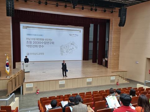 연수 주요 내용은 ▲ 수업 대전환을 선도하는 2030교실 정책 안내 ▲ 미래수업 철학 세우기 ▲ 전남 미래교육 대비 및 학생 주도성 키움 수업 설계 및 실연 등으로 구성됐다.