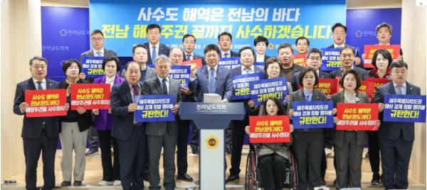 [중앙뉴스라인, 김민수기자] 전라남도의회는 3월 11일 도의회 브리핑룸에서 제주도가 제기한 사수도 인근 해역 권한쟁의 심판 청구에 대해 강력히 규탄하고 ‘전남도민의 주권과 자치행정 관할권을 사수하자’는 성명서을 발표했다.
