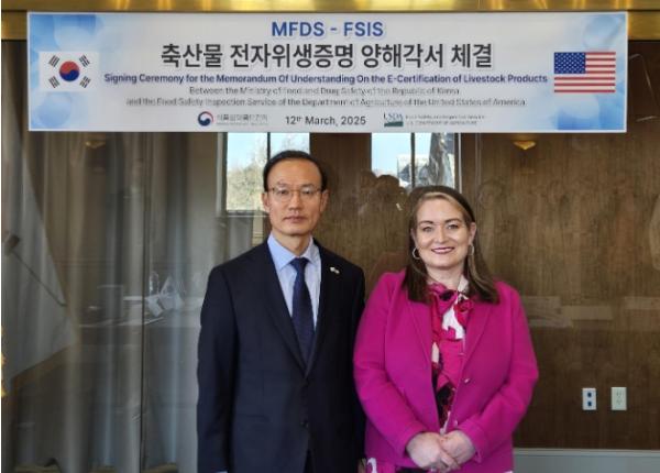 [중앙뉴스라인, 신기철기자] 식품의약품안전처는 우리나라로 수입되는 미국산 축산물에 대해 수출국(미국) 정부가 발행하는 위생증명서의 디지털 전환을 위한 ‘한-미 수출입 축산물 전자위생증명 협력 양해각서(MOU)’를 미국 식품안전검사청(FSIS)과 3월 13일(현지시간 3월 12일) 미국 워싱턴D.C에서 체결했다고 밝혔다.