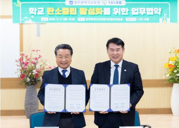 [중앙뉴스라인, 전은희기자] 광주시교육청과 사단법인 1.5℃포럼은 17일 광주광역시교육청시민협치진흥원 소강당에서 이정선 교육감, 1.5℃포럼 최용국 회장 등 관계자가 참석한 가운데 ‘학교 탄소중립 활성화를 위한 업무협약’을 체결했다.