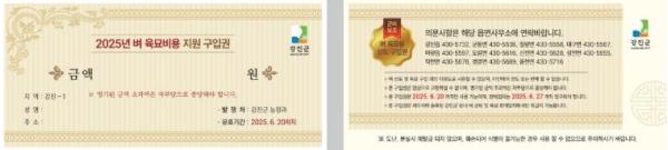 ‘벼 육묘 비용 지원 구입권’은 군에서 지난 2023년부터 벼 육묘용 상토와 육묘 구입으로 제한돼 있던 사용을 농자재 등을 구입이 가능하도록 사용 범위를 확대, 농가들로부터 높은 만족도를 얻고 있다.
