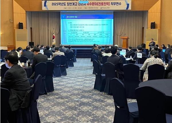 [중앙뉴스라인, 김민수기자] 전라남도교육청은 27~28일 호텔현대 바이라한 목포에서 일반계고 학교장과 교감을 대상으로 진로 · 진학 직무연수를 열고, 학력 향상과 대입 경쟁력 강화 방안을 모색한다.