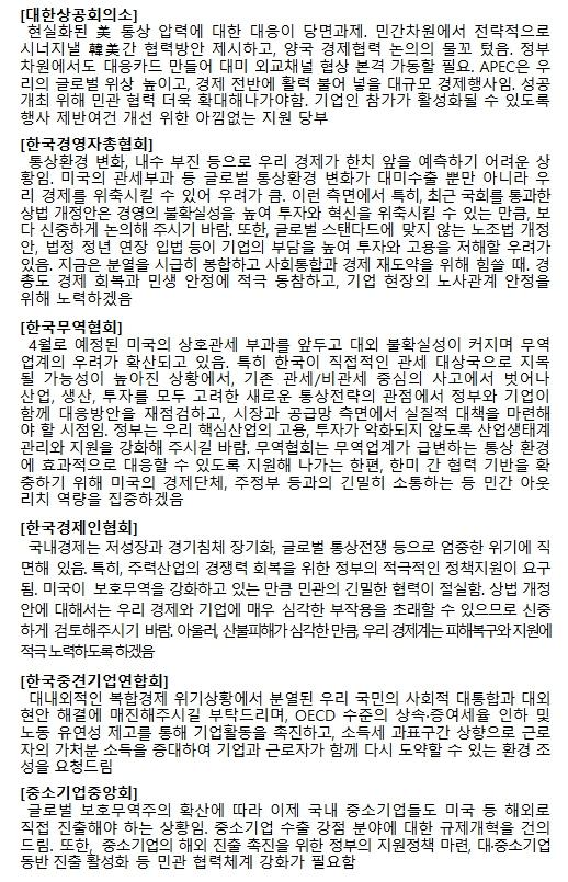 이날 경제6단체 대표들은 현재의 위기 극복과 경제 회복을 위해, 업종별 맞춤형 대책 마련, 주력산업 경쟁력 회복을 위한 대미 협력 강화 등 다양한 의견을 제시하고, 경제단체도 정부와 긴밀히 협력하며 적극적인 역할을 해나가겠다고 밝혔다.