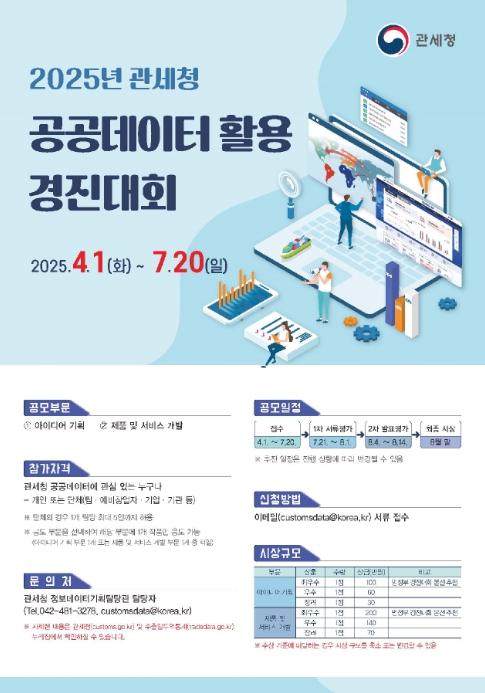 [중앙뉴스라인, 우제헌기자] 관세청은 공공데이터로 개방된 관세무역데이터를 활용한 혁신적인 창업아이디어를 발굴·지원하기 위해 4월 1일부터 '2025년 관세청 공공데이터 활용 경진대회'를 개최한다.