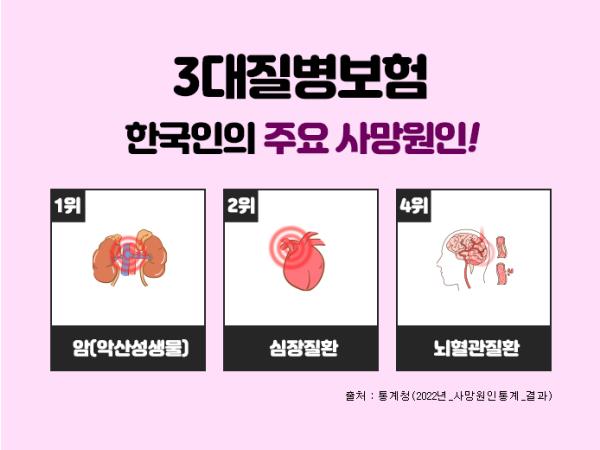 [중앙뉴스라인, 한성영기자] 3대질병으로 일컬어지는 암, 뇌혈관질환, 심혈관질환은 한국인의 주요 사망원인에서 상위를 차지하고 있으며, 이에 대한 진단비를 집중적으로 보장해 주는 보험상품을 3대질병진단비 보험이라 할 수 있다.