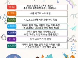 행사는 지난 5일 ‘2025 초등영재교육원 개강식’ 및 ‘중등 영재 융합과정 무등산 생태탐사’를 시작으로 ▲4월 12일 초등 사고력 수학체험 ▲17일 나도 S.C.(과학 커뮤니케이터) 특강 ▲19일 가족과 함께 하는 체험이 있는 과학 특강(종이비행기 국가대표 초청 체험 특강) ▲26일 가족과 함께하는 과학체험교실 ▲5월 1~22일 팝업 사이언스 랩 ▲10일 ‘가족과 함께 하는 대전·대구 국립 과학관 체험’ ‘가족과 함께 하는 수학 체험 교실’ 등으로 진행된다.