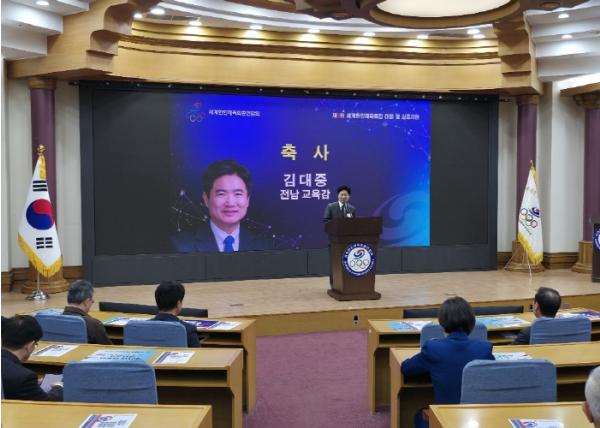 김대중 교육감은 축사에서 “제9회 세계한인체육회장 대회 겸 심포지엄의 개최를 진심으로 축하드리며, 세계한인체육회총연합회가 전 세계 재외동포 사회를 하나로 연결하고 있는 데 깊이 감사드린다”고 전했다. 이어 “전라남도교육청은 ‘K-에듀’를 매개로 세계와 소통하고, 학생들이 글로벌 시민으로 성장할 수 있도록 적극 지원하겠다”며, “글로컬 전남교육은 아이들의 꿈 무대를 지구촌으로 확장하는 교육이며, 스포츠와 교육을 통해 민족의 정체성과 글로컬 감각을 갖춘 미래 인재를 키워가겠다”고 밝혔다.
