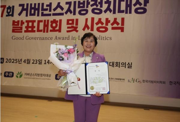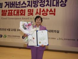 조영임 의원은 23일 국회의원회관에서 열린 ‘2025 거버넌스 지방정치대상’에서 지방의원 부문 주민편익 증대분야 ‘최우수상’을 수상했다.