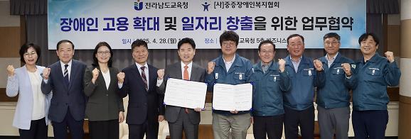 [중앙뉴스라인, 김민수기자] 전라남도교육청은 28일 청사에서 (사)중증장애인복지협회와 장애학생 고용 확대 및 일자리 창출을 위한 업무협약을 체결했다.