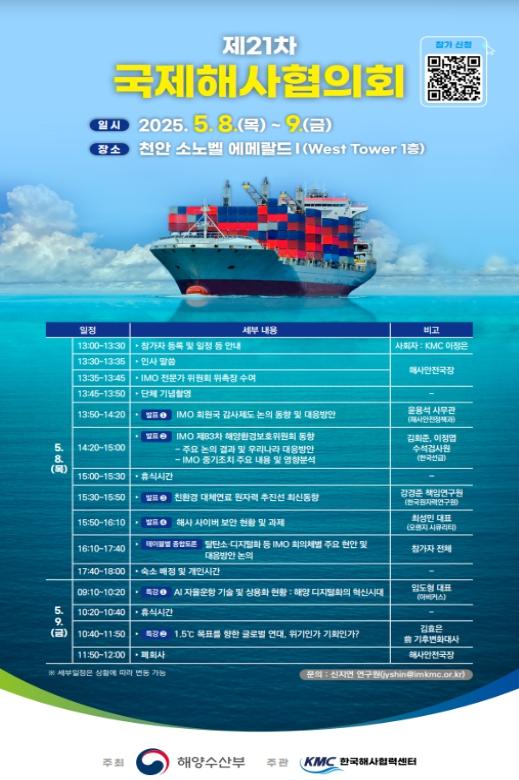 [중앙뉴스라인, 우제헌기자] 해양수산부는 5월 8일과 9일 이틀간 천안에서 ‘제21차 국제해사협의회’를 개최한다고 밝혔다.