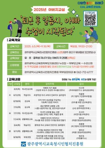 [중앙뉴스라인, 전은희기자] 광주광역시교육청시민협치진흥원은 유·초·중학생 자녀를 둔 아버지를 대상으로 오는 6월부터 9월까지 ‘2025 아버지 교실 – 퇴근 후 일곱시, 아빠 수업이 시작된다’를 운영한다.