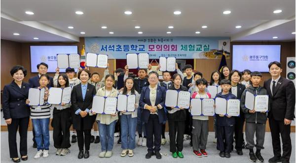 [중앙뉴스라인, 김효현기자] 광주 동구의회는 지난 9일 동구의회 본회의장에서 '2025년 청소년 모의의회 체험교실'을 개최하여 서석초등학교 학생들과 특별한 시간을 가졌다