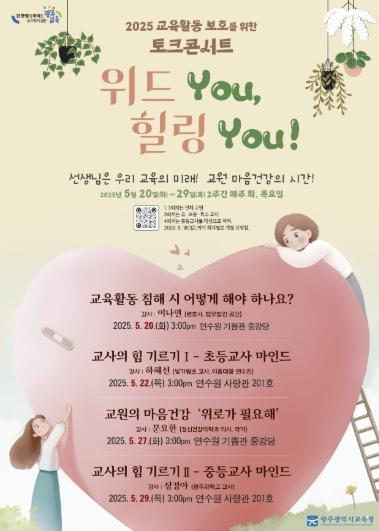 토크콘서트는 ‘위드 YOU, 힐링 YOU’를 주제로 오는 20일, 22일, 27일, 29일 4회에 걸쳐 광주광역시교육청교육연수원에서 열린다.