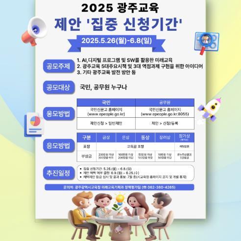 [중앙뉴스라인, 전은희기자] 광주시교육청은 26일부터 6월 8일까지 ‘2025년 상반기 광주교육 제안 집중 신청기간’을 운영한다.