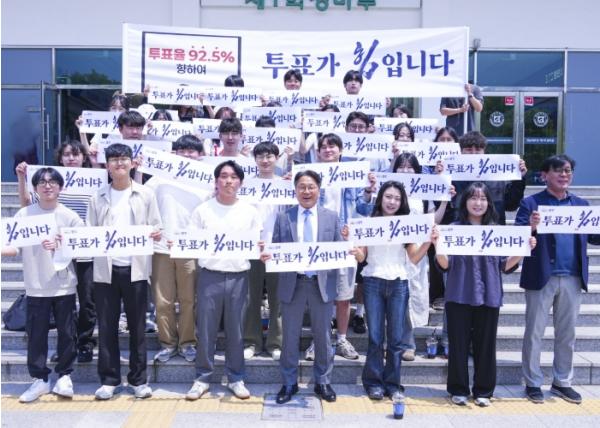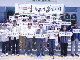 강 시장은 학생들과 광주시가 추진 중인 ‘투표가 힘입니다-92.5% 투표율 달성’ 캠페인의 의미와 투표의 중요성 설명하고, 투표 참여를 당부했다.