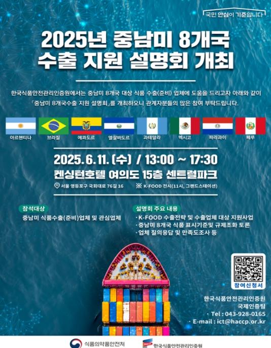 중남미 8개국에 식품을 수출하거나 수출을 희망하는 업체는 한국식품안전관리인증원 누리집에서 사전 신청을 하고 설명회에 참석할 수 있다.