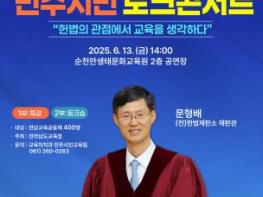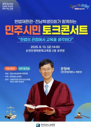 [중앙뉴스라인, 김민수기자] 전라남도교육청은 13일 오후 2시 순천만생태문화교육원에서 문형배 전 헌법재판소 재판관을 초청해, ‘헌법재판관-전남학생의회와 함께하는 민주시민 토크 콘서트’를 개최한다.