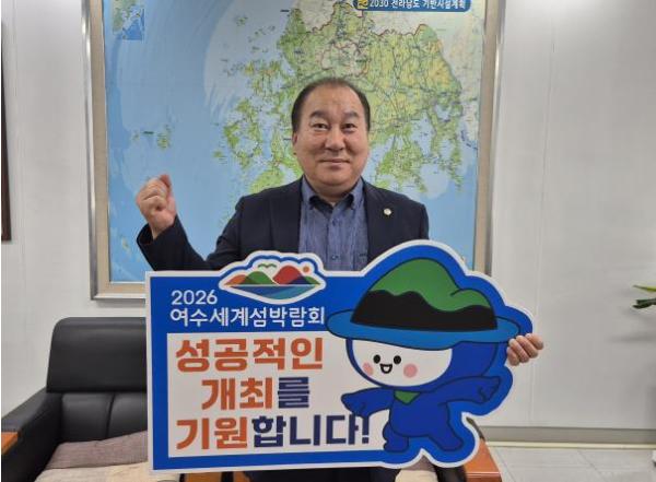 [중앙뉴스라인, 김민수기자] 전라남도의회 강정일 도의원(광양2, 더불어민주당)이 6월 24일 ‘2026 여수세계섬박람회’의 성공 개최를 기원하는 릴레이 응원 챌린지에 동참했다.