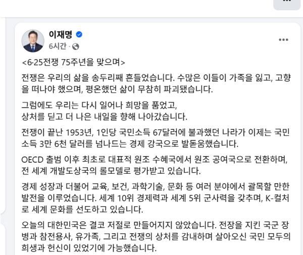 이 대통령은 이날 페이스북에 '6·25전쟁 75주년을 맞으며'라는 제목의 글을 올려 "평화가 곧 경제이자, 국민의 생존과 직결되는 시대"라며 이 같이 말했다.