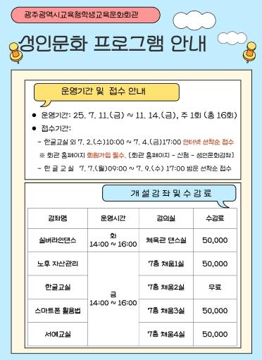 [중앙뉴스라인, 전은희기자] 광주광역시교육청학생교육문화회관은 지역 주민을 대상으로 ‘2025 성인문화프로그램’ 수강생을 선착순 모집한다.
