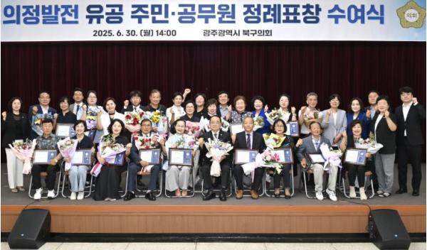 [중앙뉴스라인, 김효현기자] 광주 북구의회는 지난 30일 2025년도 2분기 정례표창 수여식을 개최해 의정발전, 사회봉사, 주민자치 3개 분야에 공이 있는 주민과 공무원에게 표창패를 수여했다고 밝혔다.