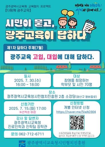 광주시교육청시민협치진흥원은 오는 10월까지 4차례에 걸쳐 광주교육 중점사업 설명회 ‘시민이 묻고, 광주교육이 답하다’를 운영한다.