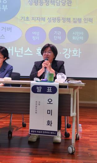 끝으로 오 의원은 “성평등은 제도가 아니라 실천으로 이뤄지는 것”이라며, “정치는 민주주의를 실현하는 가장 강력한 도구로 여성 스스로가 정치의 주체가 되어야 지역이 변화하고 진정한 민주주의가 발전할 수 있다”며 여성들의 적극적인 정치 참여를 독려하는 것으로 발표를 마무리했다.