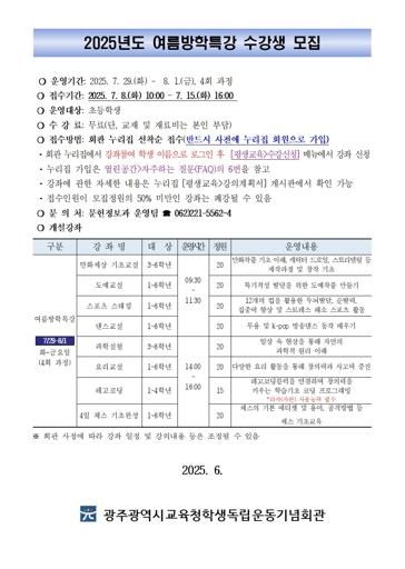 여름방학 특강은 오는 29일부터 8월 1일까지 4일간 진행된다. 이 기간 ▲만화세상 기초교실 ▲도예교실 ▲스포츠 스태킹 ▲댄스교실 ▲과학실험 ▲요리교실 ▲레고코딩 ▲4일 체스 기초교실 등 8개 강좌가 진행되며, 수강료는 무료다. 단, 교재 및 재료비는 수강생이 부담해야 한다.