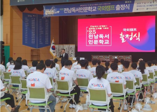 [중앙뉴스라인, 김민수기자] 김정희 전라남도의회 교육위원장은 2025년 7월 14일 전라남도교육청학생교육원에서 열린 ‘전남독서인문학교 국외캠프 출정식’에 참석해, 참가 학생들에게 “질문과 성찰의 힘을 키워 세계와 소통하는 미래인재로 성장하길”고 당부했다.
