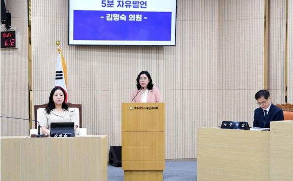 끝으로 김명숙 의원은 “아이들의 안전과 주민의 삶, 지역의 미래를 지탱하는 학교 설립 문제를 통계에만 의존하여 결정해서는 안 된다”며 “광산구가 주민을 대신해 책임 있는 자세로 적극 추진해 주길 바란다”고 촉구했다.