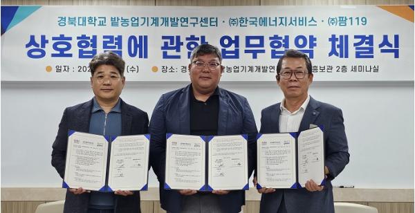 [중앙뉴스라인, 한성영기자] 경북대학교 밭농업기계개발연구센터에서 7월 16일(화) 오전 11시, 농업 분야의 지속가능성과 혁신을 이끌기 위한 산학연 업무협약(MOU) 체결식이 열렸다. 이날 협약은 경북대학교, ㈜한국에너지서비스, ㈜119팜 등 3개 기관이 참여한 가운데 진행됐으며, 각 기관은 영농형 태양광 시스템과 친환경 방제 기술, 농업 에너지 효율화 기술의 공동 개발 및 실증을 통해 탄소 중립형 농생명 시스템 구축에 협력하기로 합의했다.